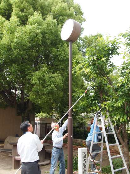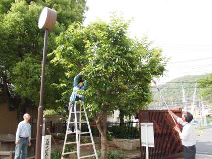 桜の木の葉っぱが生い茂り,おかげで時計が見えなくなりました。ご近所の方に枝の切り方などを教えていただき,高枝切りばさみやのこぎりを使って管理用務員さんが切りました。出来栄えは…ご覧のとおりです。