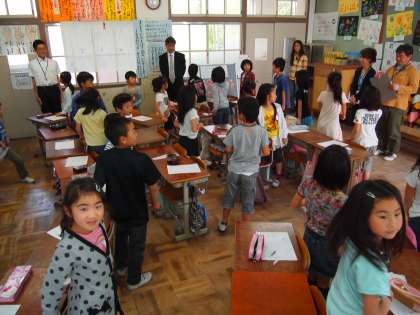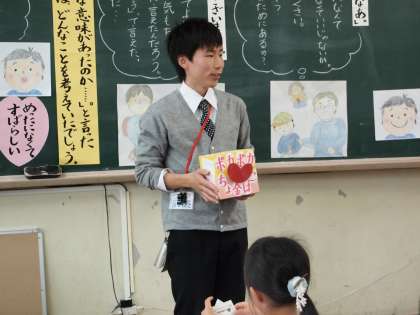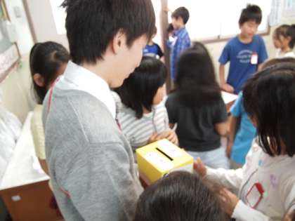 授業の最後は「ありがとう」と言われた経験を一人ずつがメモに書き込んで「ぽかぽか貯金箱」に投函しました。