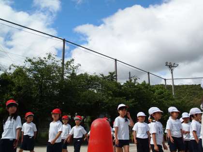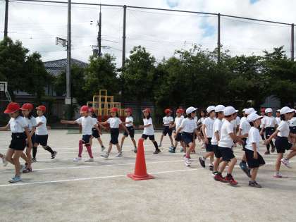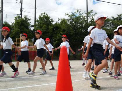 最後はこの赤いコーンで赤組と白組に分かれていきます。