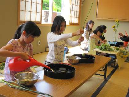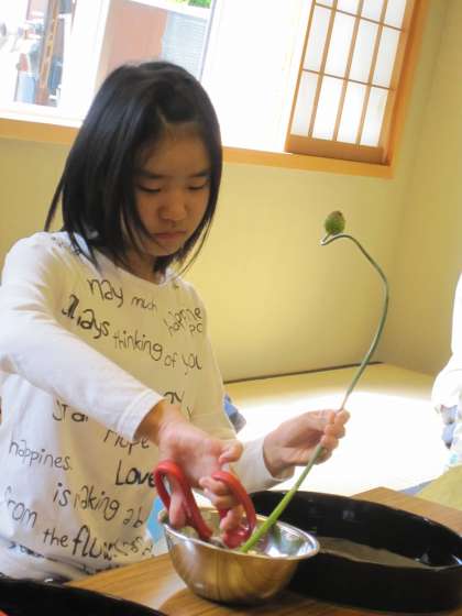 10時に集まってきた子ども達は,草月流の先生方に指導していただきながら,生け花を始めました。