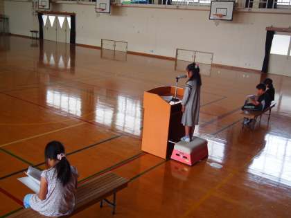 6月5日(木)は第2回の「きらめきタイム」です。今回は2年1組と4年1組です。今日は2回目の練習です。2年生はまだこれから覚えるところですが,一生けんめい頑張っています。4年生はさすがです。だいぶ覚えかけています。まだ少し日があるのでバッチリ発表してくれるものと思っています。がんばろうね!