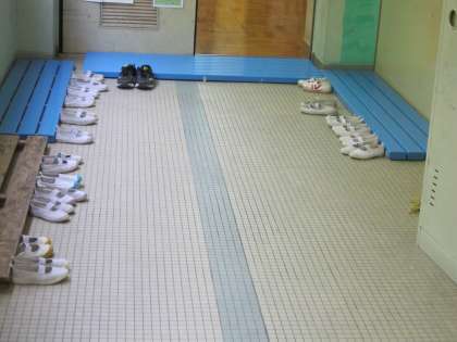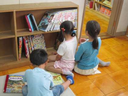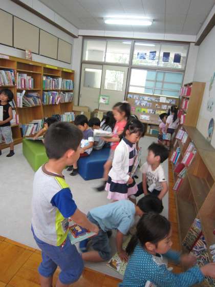 1年2組の子どもたちは,図書室で読書をしたり本を借りたりしていました。入口の靴はとてもきれいに並んでいました。見ているだけで気持ちがすっきりしてきました。