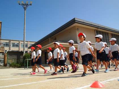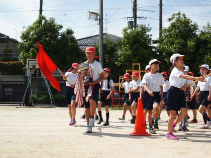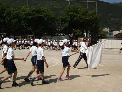 全校の行進はグラウンドを1周半します。