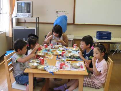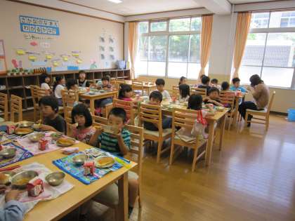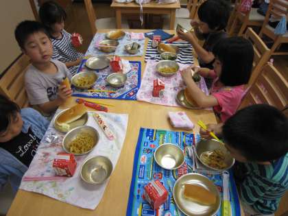いつもと違う部屋での給食にわくわくしながら楽しく食べていました。