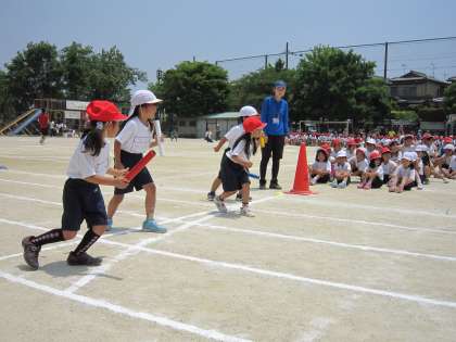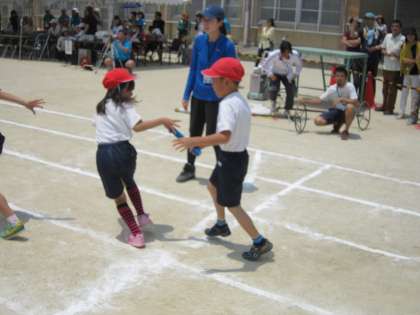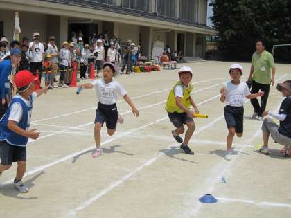 低学年リレーでは,1・2年生は半周,3年生は1周走ります。