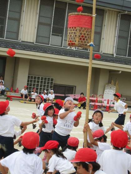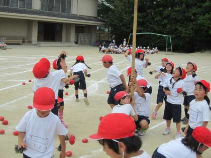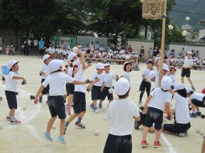 1年生にとっては少し高い籠の中に玉を入れようと懸命に投げていました。
