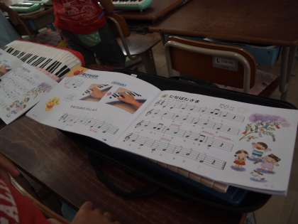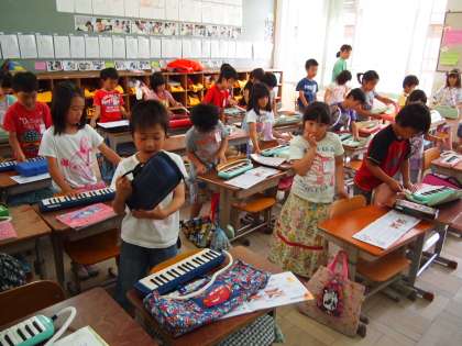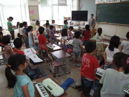 2年2組はちょうど音楽の授業が終わってあいさつをしているところです。今日は「たなばた」を鍵ハモで吹いて「指せばめ」というテクニックを学んだようです。