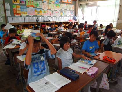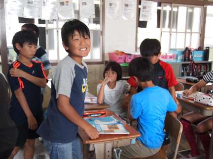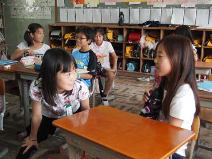 5年1組です。ここも算数が終わりお茶を飲んだり,友だちと話したり…。楽しそうですね。