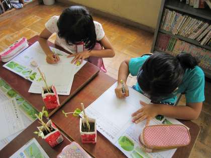 今日の観察は,ひまわりとホウセンカでした。観察カードに見たことをかこうとしていました。