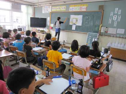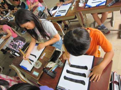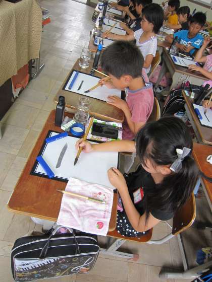 自分たちですった墨を筆につけ,はじめ「一」という字を書きました。