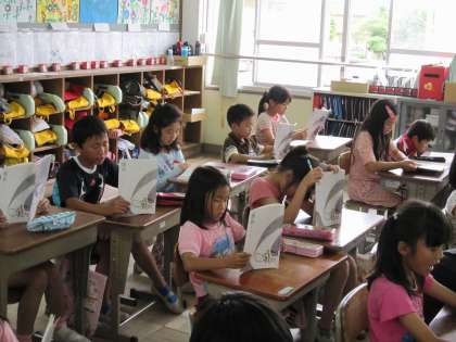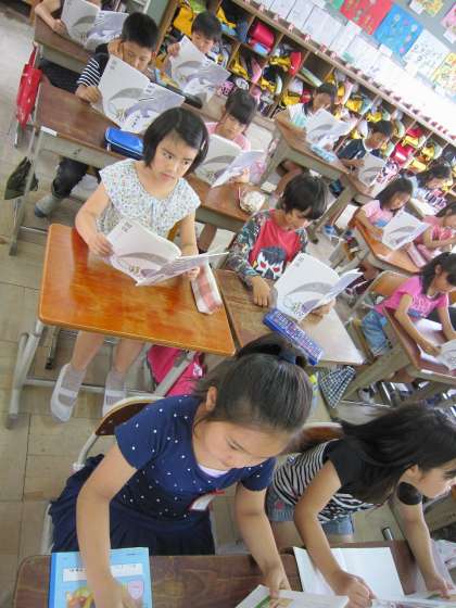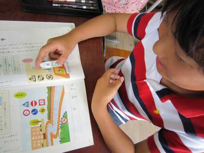 音読の前の準備の時間に,ある男の子が消しゴムを手に「あっここにもあったよ。」と教科書に示されている記号と同じ記号があることに気付いていました。これからいろいろなところで記号を発見してくれればと思います。