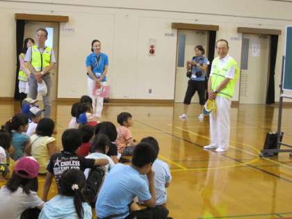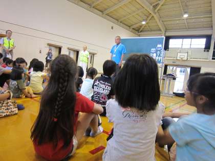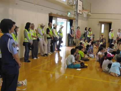 学校に来た子らは,体育館に入り,交通安全推進委員会の福岡様や学校長よりお話を聞きました。