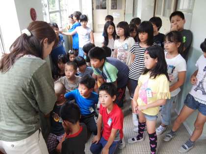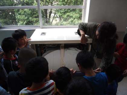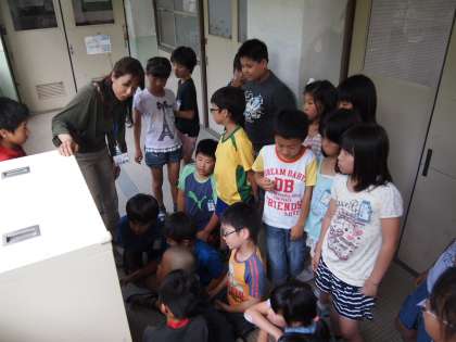 4年1組は校舎の中の安全設備(消火栓や救助袋など)について,みんなで歩いて確かめ合っていました。特に,救助袋が入っているロッカーは開けて見ることはないので,新鮮な気分で見ていました。