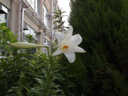 本館と中校舎の花壇に白いユリが咲きました。正門付近のガクアジサイの横には淡い赤紫のキクのような花が咲いています。(名前がわからないのですが…)雨上がりは学校の花も生き生きしているように見えます。