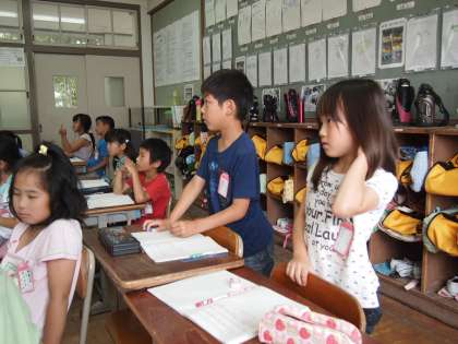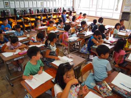 2年1組は算数の問題にトライ。「ふえたのがいくつかかんがえよう」というめあてです。「花壇の花が咲いた」という問題のようです。
