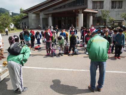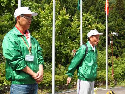強力な助っ人紹介。少年補導嵐山東支部から今年も応援に来ていただきました。「よろしくお願いします。」   これが山登りの正しいスタイルです。裾の当たりの処理はヒル対策ですね。