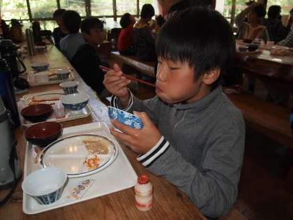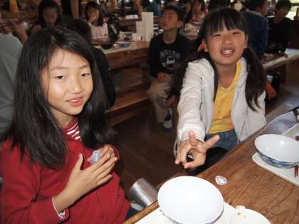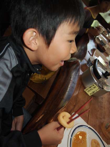 フライドポテトは「ニコニコマーク」の形をしています。お箸で刺すのにはピッタリですよ。(笑)