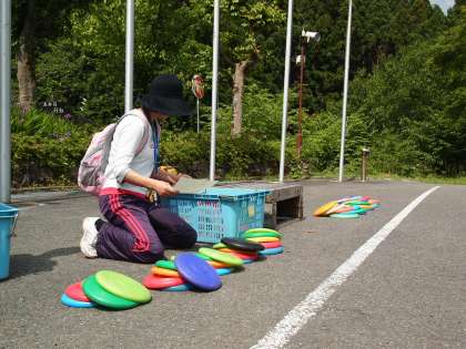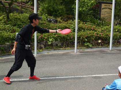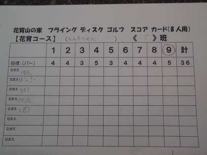 フライング ディスク ゴルフのルールはゴルフとよく似ています。「花背」と「雲取」の2コースを合計回数で競います。「賞金総額0円ですがみんな頑張るように…」とお話がありました。