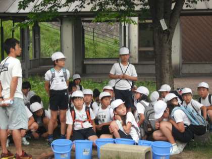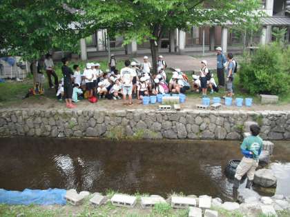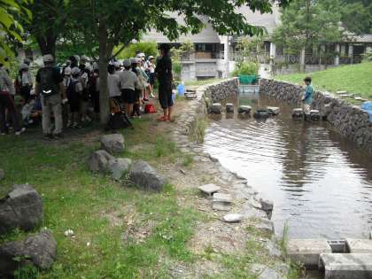魚つかみの場所に来ました。本館の満七にある人口の川の両端をせき止めて行います。」