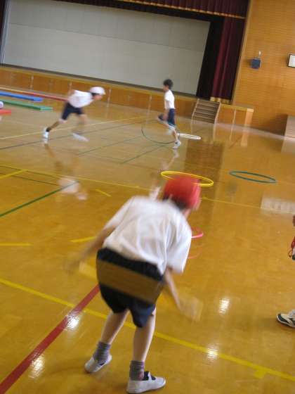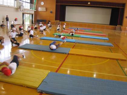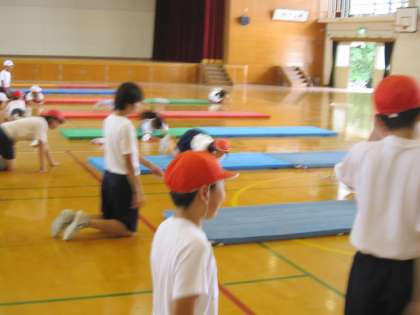 6年1組では,これから始めるマット運動の導入として,マットに慣れ親しむ運動をしていました。