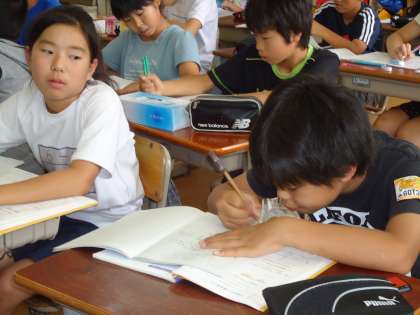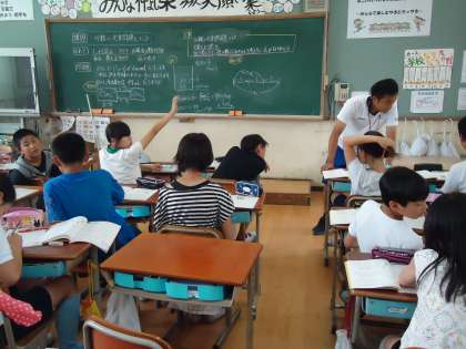6年1組です。「分数の文章題を解こう」にチャレンジ…。「分数だけならいいのですが,そこに割合の要素が入ると…なかなかキビシイですよ」と担任の先生も苦笑い。そんな時「校長先生,これ分かる?」と聞かれました。苦笑いしました。
