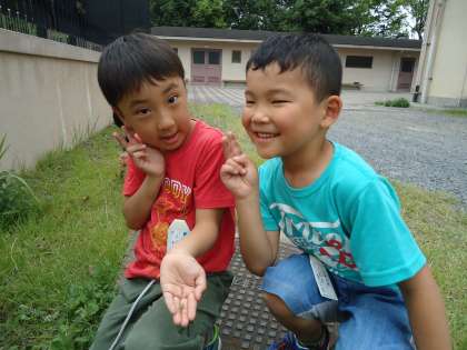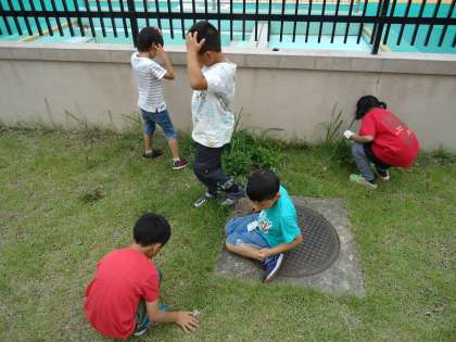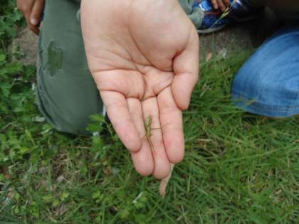 プールの近くで子どもたちが何やらしています。夢中でやっているような感じだったので,近づいてみました。おぉ,手のひらにカマキリの赤ちゃんが…。他にもたくさんいるのだそうです。