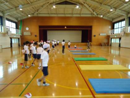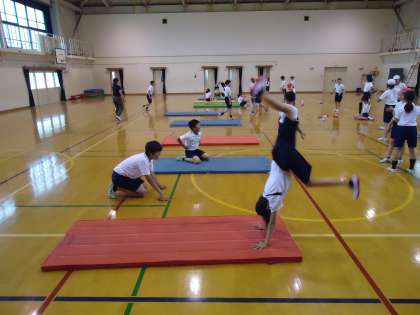 6年2組はマット運動の時間です。倒立からブリッジへの移行を練習していました。大きく振りかぶることやいったん止めることを意識したいところです。