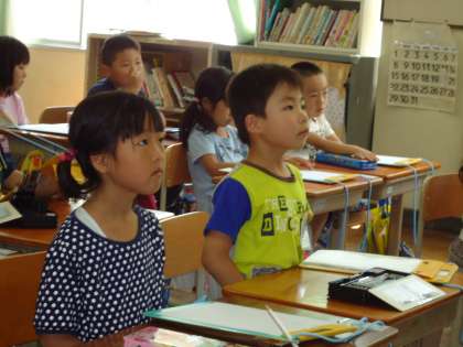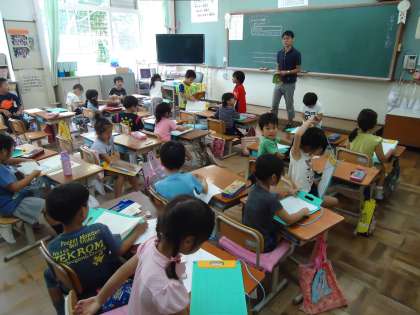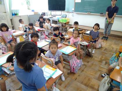 1年2組はアサガオの観察に行くところでした。観察学習のポイントを聞いたり発表したりしています。