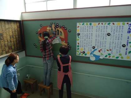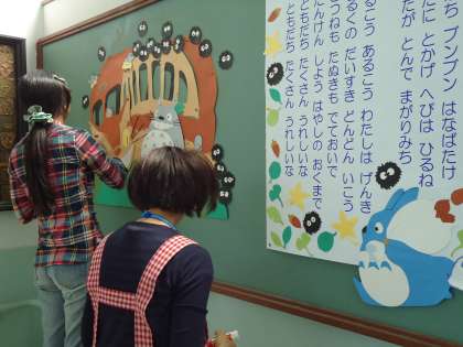 本館2階の掲示板が衣替え…。「トトロ」の猫バスが登場しました。