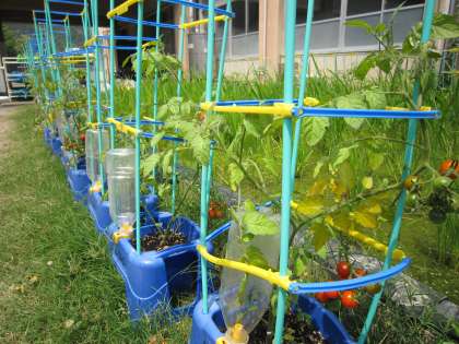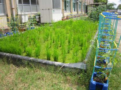 花壇の所のミニトマトや田んぼの稲が,すくすく育っています。