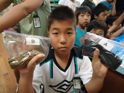写真の実験は豊かな森と,そうでない地面に雨が降った場合の水のゆくえやきれいさの比較です。