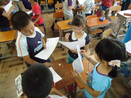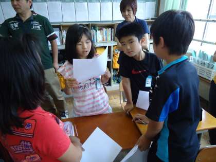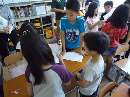 子どもたちが自分の考えをグループの友だちに伝えます。その中で「ぼくと同じ考えだ」と自信を持ったり,「それは気が付かなかったなぁ…なるほど!」と考えを深めたりしていきます。