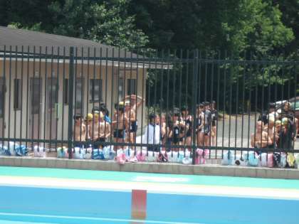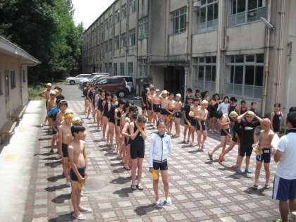 はじめ注意をプールの外で聞き,準備運動をしました。
