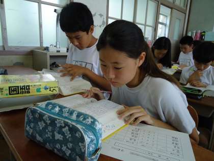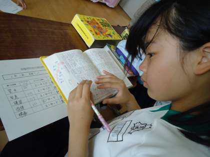 制限時間は5分間です。図書委員会の子どもたちの合図で一斉に引き始めます。集中力をMAXに子どもたちは辞書と格闘しています。