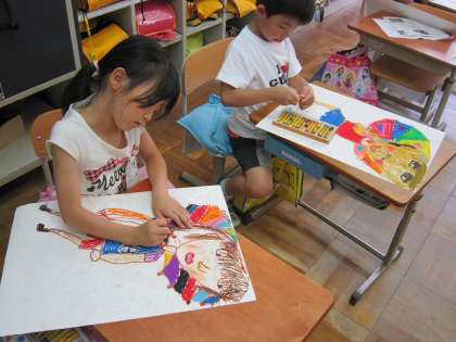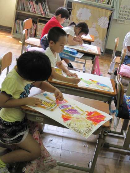 1年生は,図工で「あめのひ」というテーマで絵を描いています。