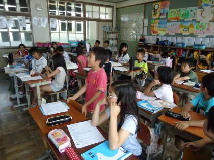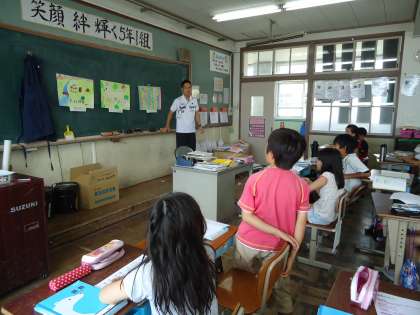 5年1組でおもしろいことをしていました。友だちが発表したことに「自分の考えを付け加えて話す」という訓練です。黒板にはその材料となる絵やエプロンなどが貼られています。クラス全員が話し切るまで続けられたようです。