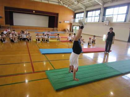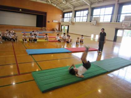 今日は,倒立前転の練習を中心に取り組んでいました。見ていると,この時間に上達した子たちがみんなの前で,倒立前転を披露していました。