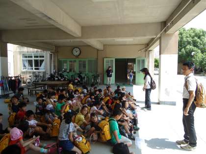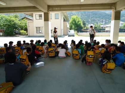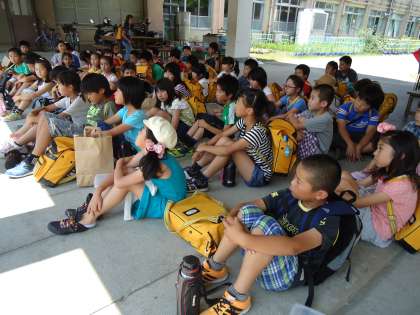 4年生が帰ってきました。今日は朝から「京都モノ作りの殿堂・工房学習」に行っていたのですが,バスを降りて阪急嵐山付近から歩いてきました。とても暑い午後でしたが,正門を入ってから大渡り廊下で話が聞ける状態になるまで「アッ」という間でした。
