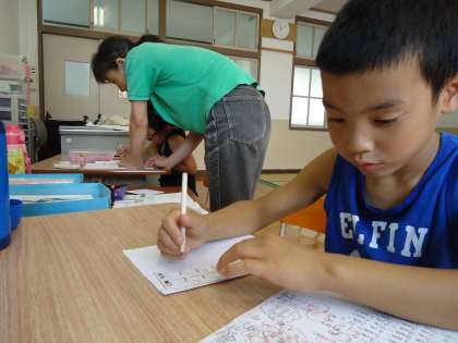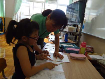 こちらではひっ算の計算の真っ最中…。先生の「手作り計算機」がお助けマンに…。ワクの中にしっかり書き込めば…計算もバッチリです。