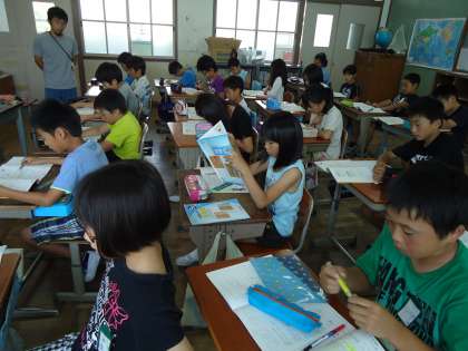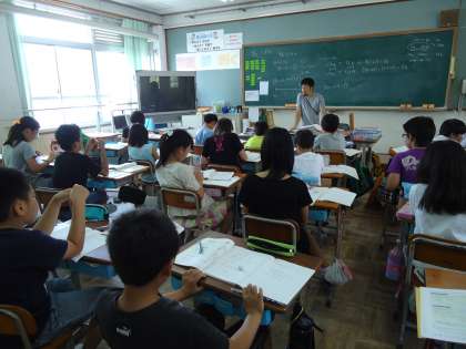 5年2組は算数です。わる数が小数の場合,同じ数をわる数とわられる数にかけて,わる数を整数にしてから解いていく…というやり方の勉強です。このくらいになってくると,ちょっとやっかいですね。
