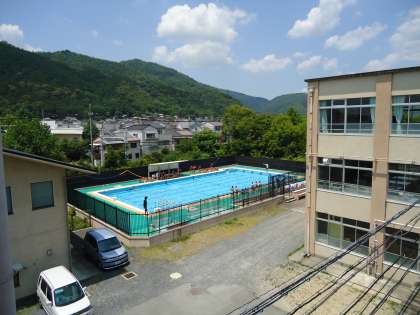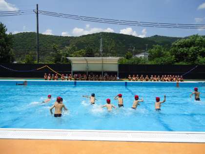 中校舎の西端から3年生の水泳の様子が見えました。近づいてみるとプールの横の長さを全力で走るというゲーム(?)をしています。最高記録は何秒でしょうね。