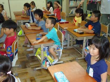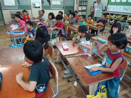 1年2組の道徳の授業です。テーマは「美しい心で」。お話は「心の優しい女の子が美しい心を行動にあらわすたびに,持っていた木のひしゃくが銀や金に変わり,最後は美しい7つのダイヤモンドが飛び出して夜空の星になる…」というお話です。