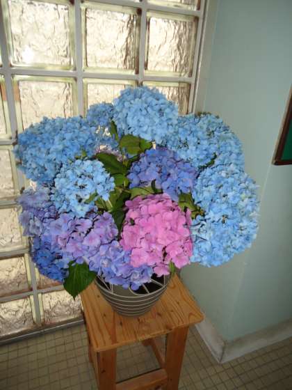 今日は避難訓練があります。週が明ければ火曜日からはもう7月に入ります。早いものですね。地域の方からアジサイをたくさんいただきました。この後,場所を考えて飾らせていただきます。鮮やかな青やピンク,紫に季節の移ろいを感じます。本当にありがとうございます。