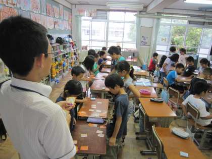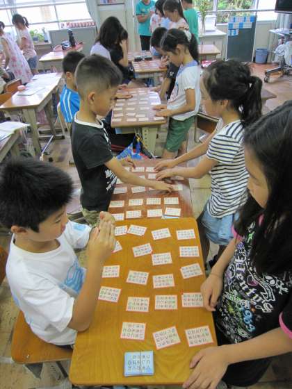 担任が早口で読み上げるのを聞いて,「はい」「はい」と札をとる子ども達です。