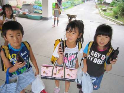 放課後,大きななすを見せてくれました。横にいた子どもが,わたしはピーマンを育てていて大きくなっていると教えてくれたので,一緒に畑まで見に行きました。おいしそうなピーマンができていました。
