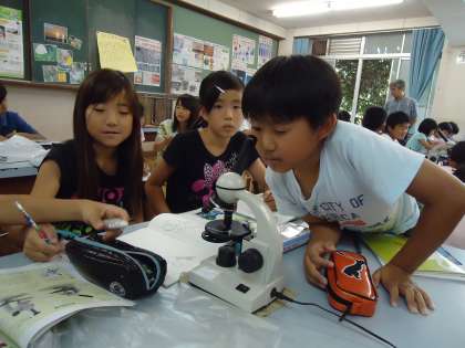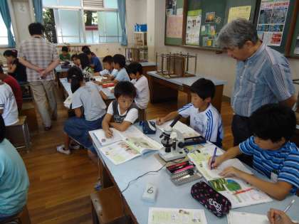 5年1組は理科で「顕微鏡の使い方」の学習です。今日から昨年度に引き続き理科支援員の先生に来ていただけるようになりました。いろんなことを聞いて下さいね。ところで.顕微鏡の使い方ですが,これはなかなか難しいものです。レンズの選び方やスライドガラスの扱い方…など.いろんなことがありますね。まずはたくさん触ってしっかり慣れることです。
