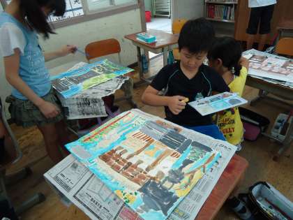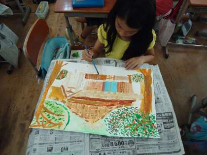 4年1組は先日の写生の続きです。チョークをハサミで削り,こぼれ落ちた粉を指でこすってバックの彩色をしている児童もいました。こういうテクニックもあるのですね。