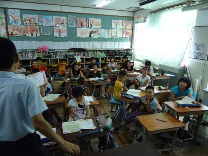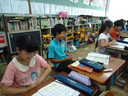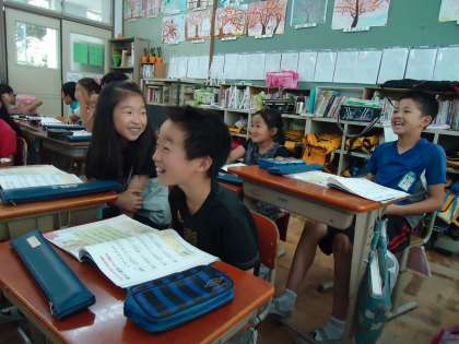 4年2組は『ラバース コンチェルト』をみんなで歌っていました。何やら約束事があって,言葉を互いによく聞き合って歌っているように見えました。それにしてもみんなうれしそうに笑っているでしょう。