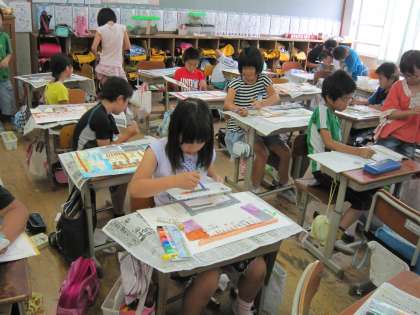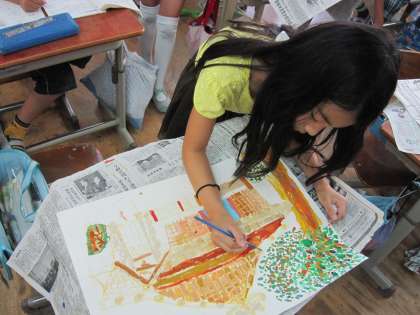 4年生は,先日松尾大社へ写生に行き,色付けを学校でしていました。