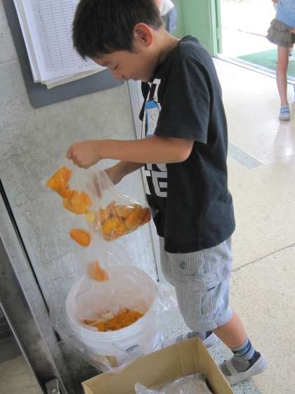 例えば,ミカンの皮と入れてきたビニル袋とを分けて捨てているのです。